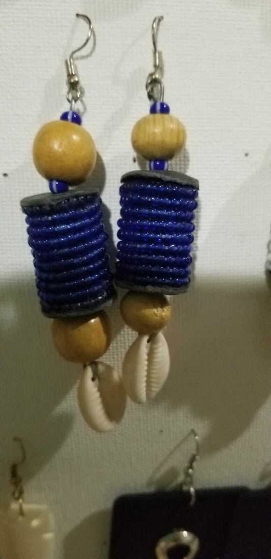Handmade Cylindrical beaded and Cowrie earrings 2 pair Lot red and blue